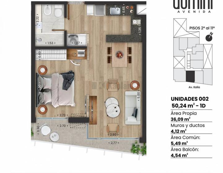 El edificio está compuesto por 36 unidades, de las cuales 18 son unidades de 1 dormitorio y 18 son unidades de 2 dormitorios. Esta compuesto por 10 niveles más planta baja y un subsuelo. En planta baja dispone de 8 plazas de estacionamiento, local comercial, y hall de acceso. En el piso 10 se localiza el salón de usos múltiples con parrillero, un gimnasio y una amplia terraza con vista hacia la avenida Centenario.