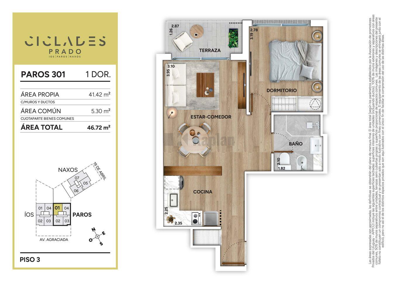 Cíclades Prado en un condominio de tres edificios, IOS, PAROS, NAXOS. implantado en un predio que atraviesa la manzana y le abre frente a dos avenidas icónicas del barrio: Av. Agraciada y Av. 19 de Abril. El proyecto cuenta con 41 apartamentos distribuidos entre monoambiente, 1 y 2 dormitorios. La propuesta se completa con una barbacoa cerrada con terraza lounge en el Rooftop.
