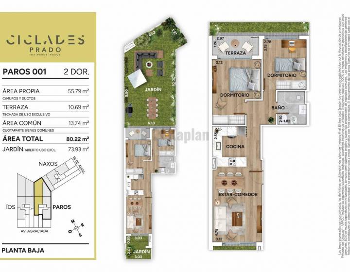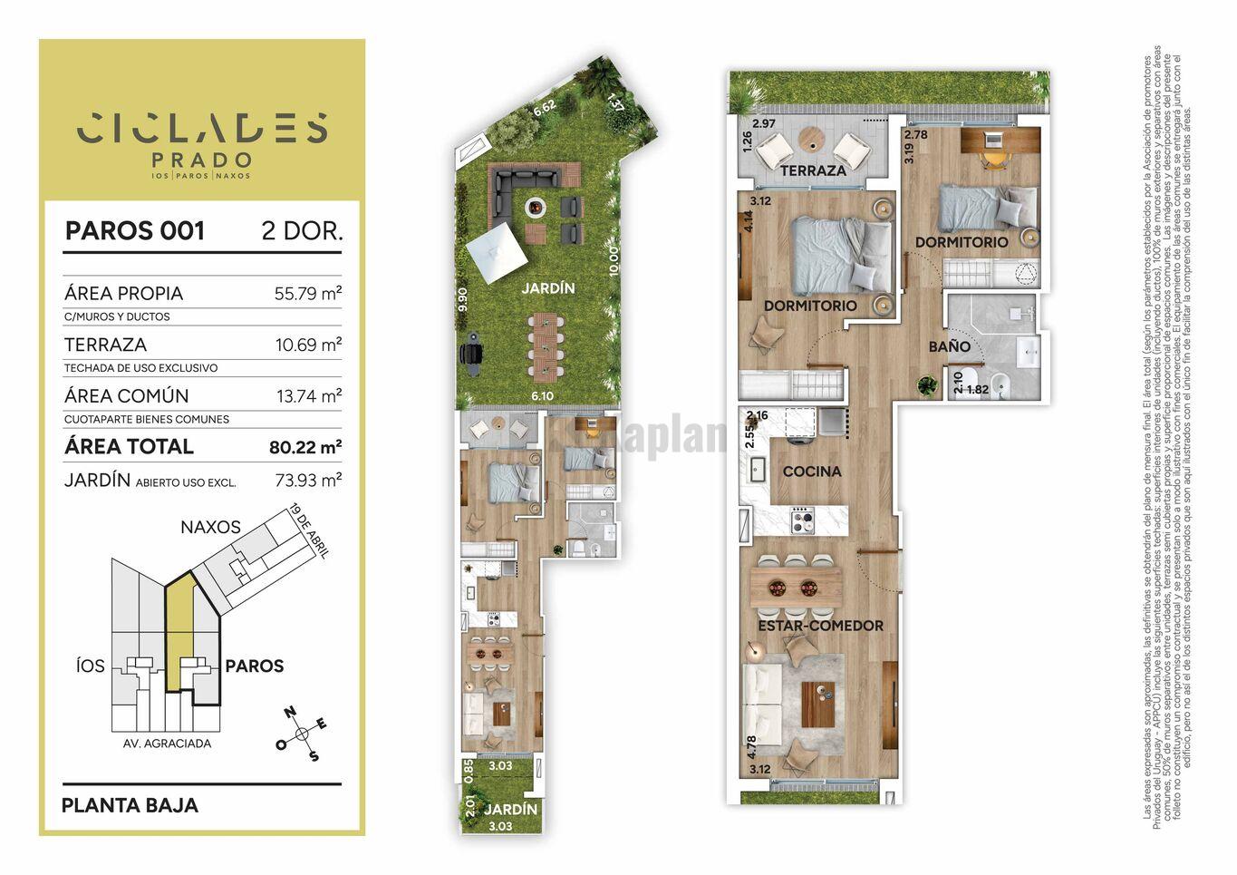 Cíclades Prado en un condominio de tres edificios, IOS, PAROS, NAXOS. implantado en un predio que atraviesa la manzana y le abre frente a dos avenidas icónicas del barrio: Av. Agraciada y Av. 19 de Abril. El proyecto cuenta con 41 apartamentos distribuidos entre monoambiente, 1 y 2 dormitorios. La propuesta se completa con una barbacoa cerrada con terraza lounge en el Rooftop.