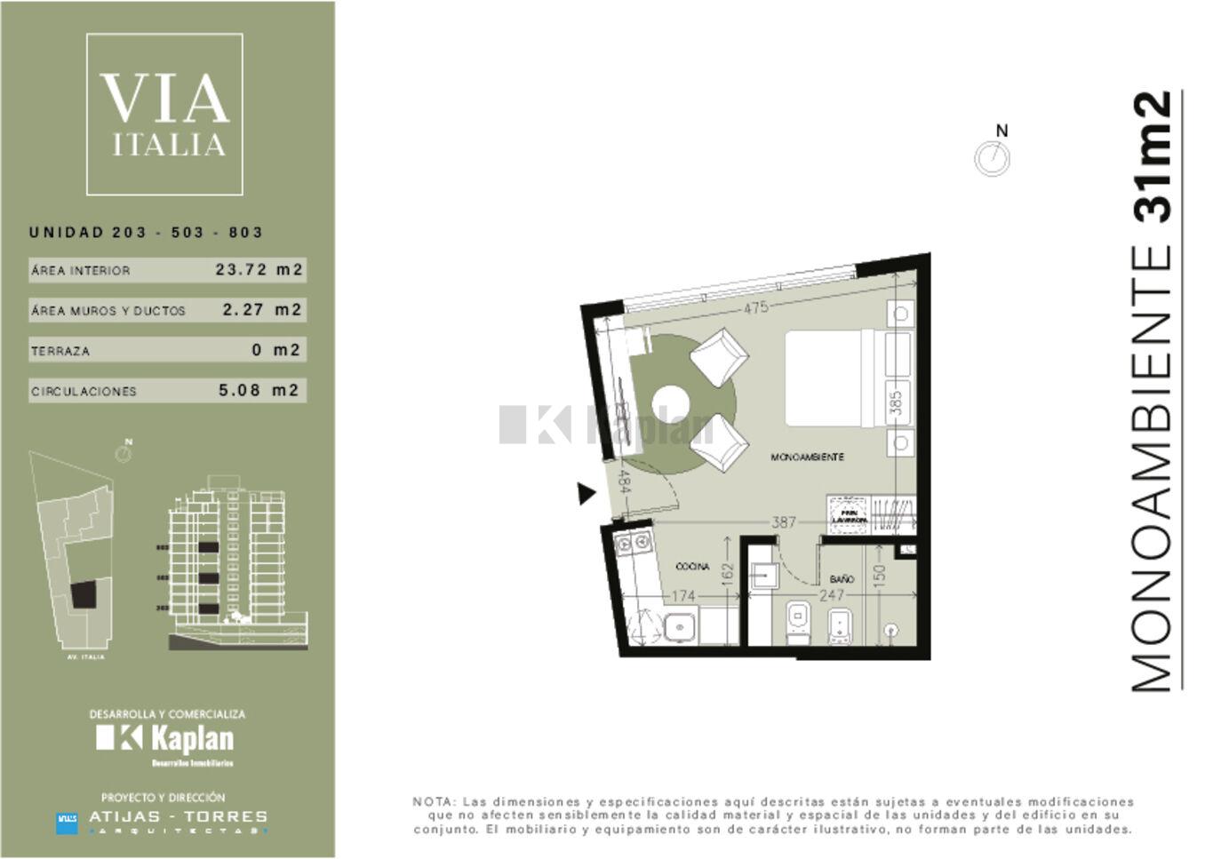 VIA ITALIA es un edificio proyectado con un diseño contemporáneo que combina estética, funcionalidad y confort. Se desarrolla en 12 pisos, con un total de 60 apartamentos distribuidos en monoambientes, 1, 2 y 3 dormitorios. En el último nivel se ubican los amenities, que incluyen una terraza con parrillero y solárium, salón de usos múltiples, gimnasio, espacio de cowork y laundry de uso común, pensados para disfrutar de las vistas, promover la convivencia y ofrecer bienestar a sus residentes.