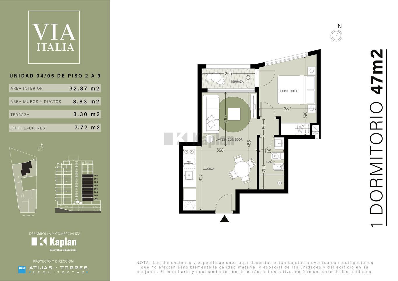 VIA ITALIA es un edificio proyectado con un diseño contemporáneo que combina estética, funcionalidad y confort. Se desarrolla en 12 pisos, con un total de 60 apartamentos distribuidos en monoambientes, 1, 2 y 3 dormitorios. En el último nivel se ubican los amenities, que incluyen una terraza con parrillero y solárium, salón de usos múltiples, gimnasio, espacio de cowork y laundry de uso común, pensados para disfrutar de las vistas, promover la convivencia y ofrecer bienestar a sus residentes.