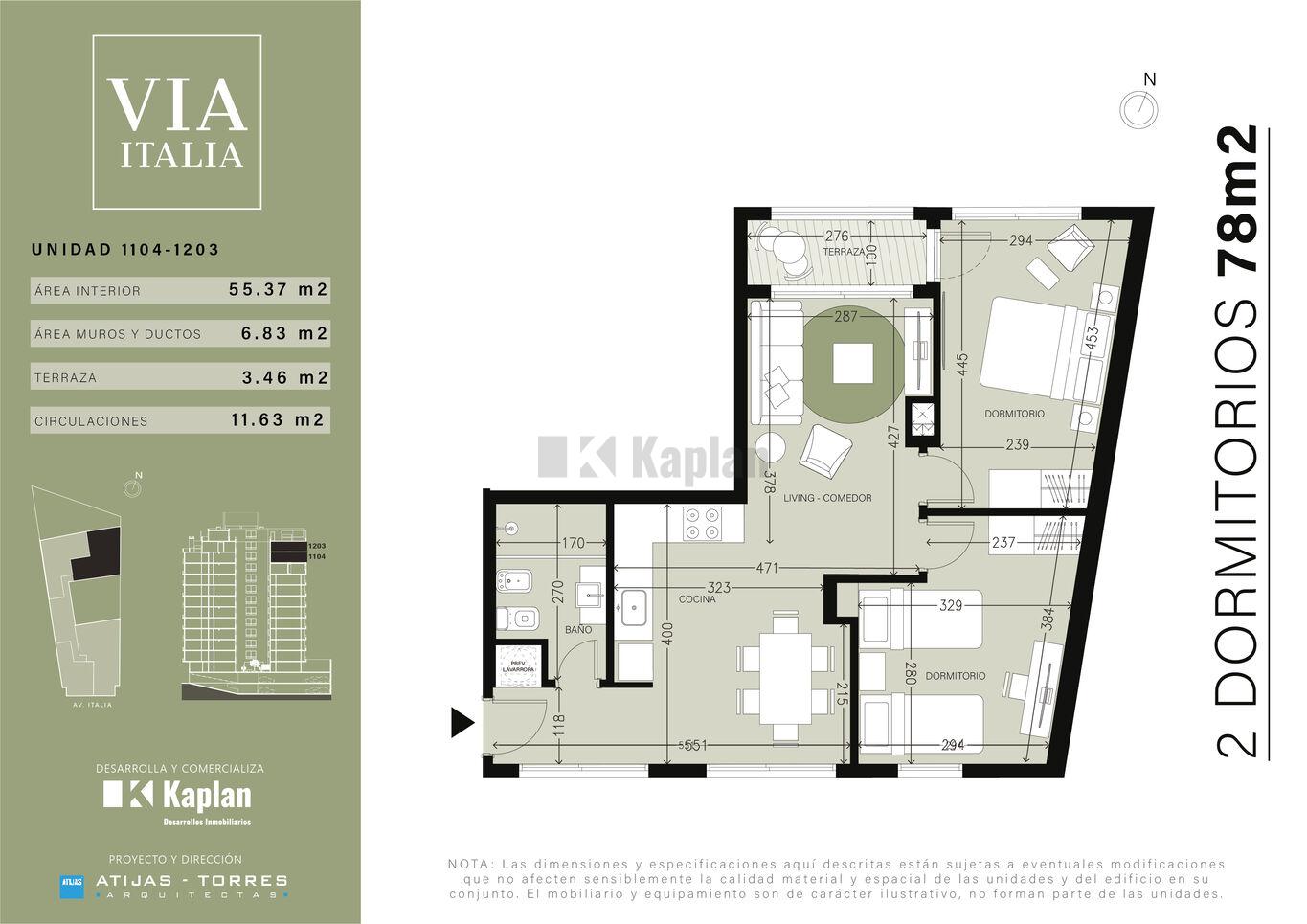 VIA ITALIA es un edificio proyectado con un diseño contemporáneo que combina estética, funcionalidad y confort. Se desarrolla en 12 pisos, con un total de 60 apartamentos distribuidos en monoambientes, 1, 2 y 3 dormitorios. En el último nivel se ubican los amenities, que incluyen una terraza con parrillero y solárium, salón de usos múltiples, gimnasio, espacio de cowork y laundry de uso común, pensados para disfrutar de las vistas, promover la convivencia y ofrecer bienestar a sus residentes.