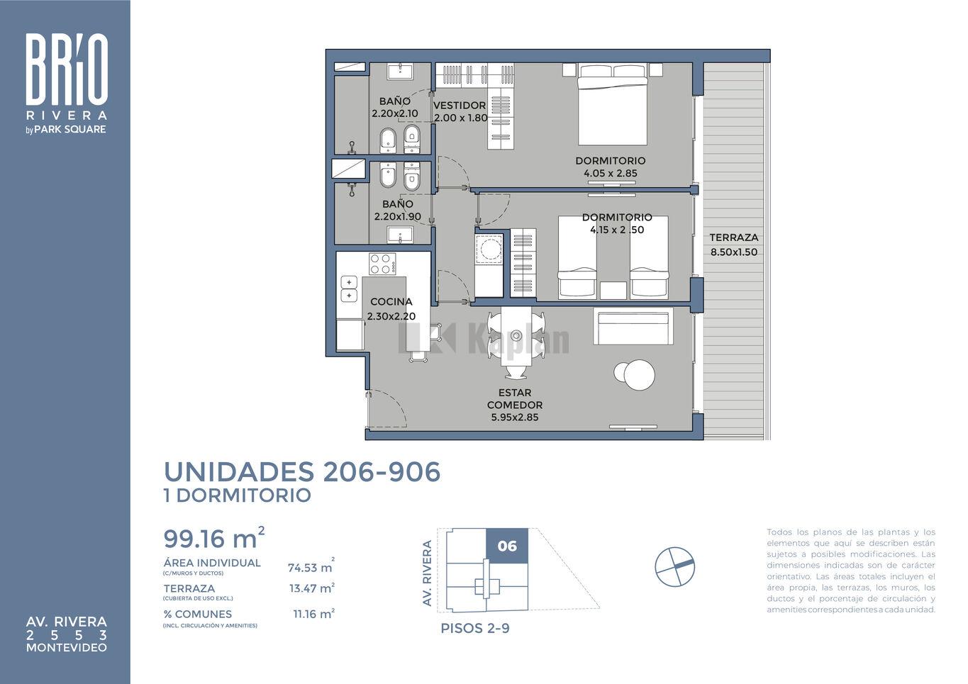 Los apartamentos combinan diseño contemporáneo y funcionalidad. Cuentan con aire acondicionado instalado en estar y dormitorios, cocinas equipadas con mesadas de granito, pileta de acero inoxidable, placares bajo y sobre mesada, así como anafe, horno y termofón instalados. Los baños incorporan sanitarios y griferías monocomando de primera calidad.
