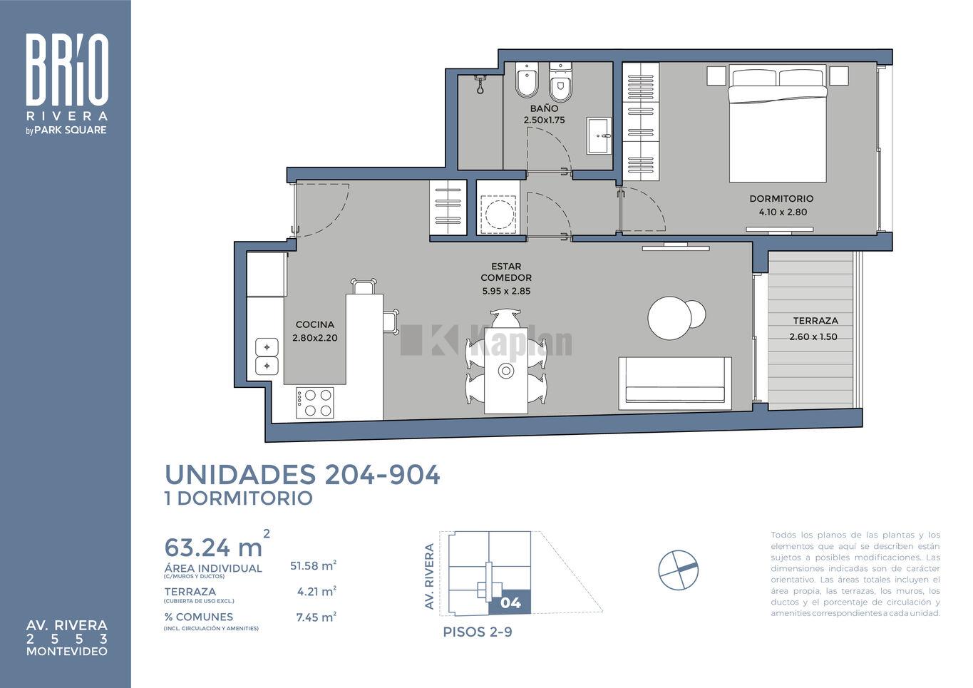 BRÍO RIVERA es un edificio moderno de 12 pisos, conformado por 48 apartamentos de 1 y 2 dormitorios. El proyecto incorpora amenities pensados para disfrutar, socializar y aportar confort al día a día: un SUM con barbacoa, gimnasio equipado y lavadero de uso común, creando espacios de encuentro y bienestar para sus residentes.