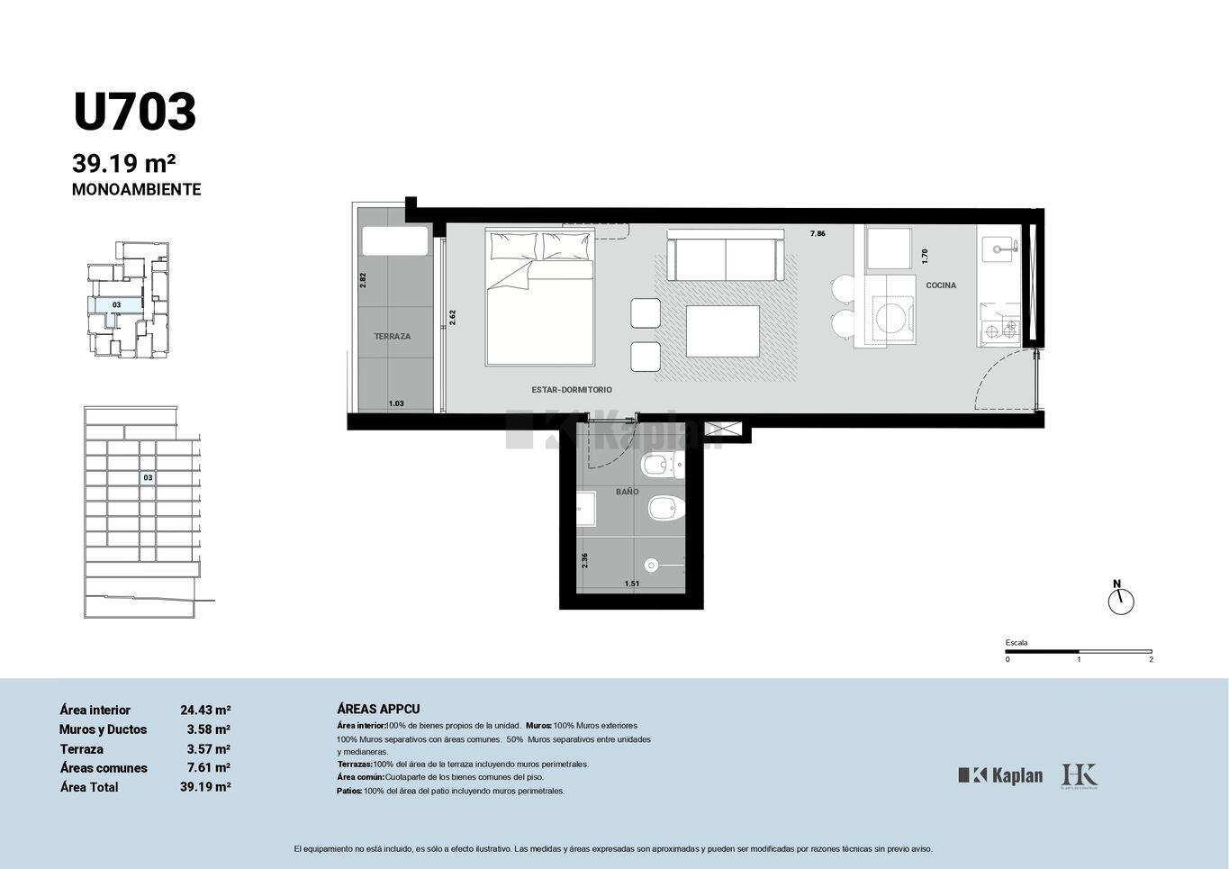 Los apartamentos presentan un diseño moderno de planta libre que integra la cocina con la sala de estar, favoreciendo la luminosidad y amplitud. Cada cocina está equipada con campana, horno y anafe eléctrico, asi como la preinstalación para aire acondicionado. Todos los apartamentos dan al frente y cuentan con terrazas privadas con barandas de vidrio.