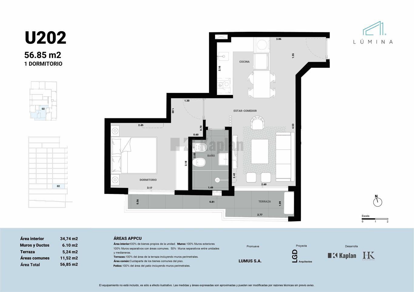 Los apartamentos presentan un diseño moderno de planta libre que integra la cocina con la sala de estar, favoreciendo la luminosidad y amplitud. Cada cocina está equipada con campana, horno y anafe eléctrico, asi como la preinstalación para aire acondicionado. Todos los apartamentos dan al frente y cuentan con terrazas privadas con barandas de vidrio.