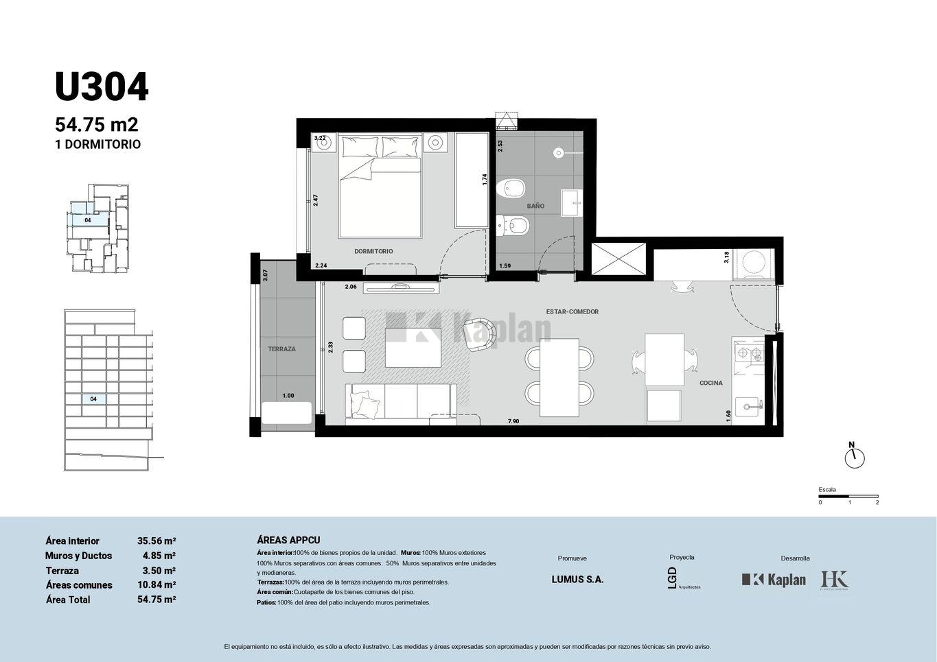 Los apartamentos presentan un diseño moderno de planta libre que integra la cocina con la sala de estar, favoreciendo la luminosidad y amplitud. Cada cocina está equipada con campana, horno y anafe eléctrico, asi como la preinstalación para aire acondicionado. Todos los apartamentos dan al frente y cuentan con terrazas privadas con barandas de vidrio.