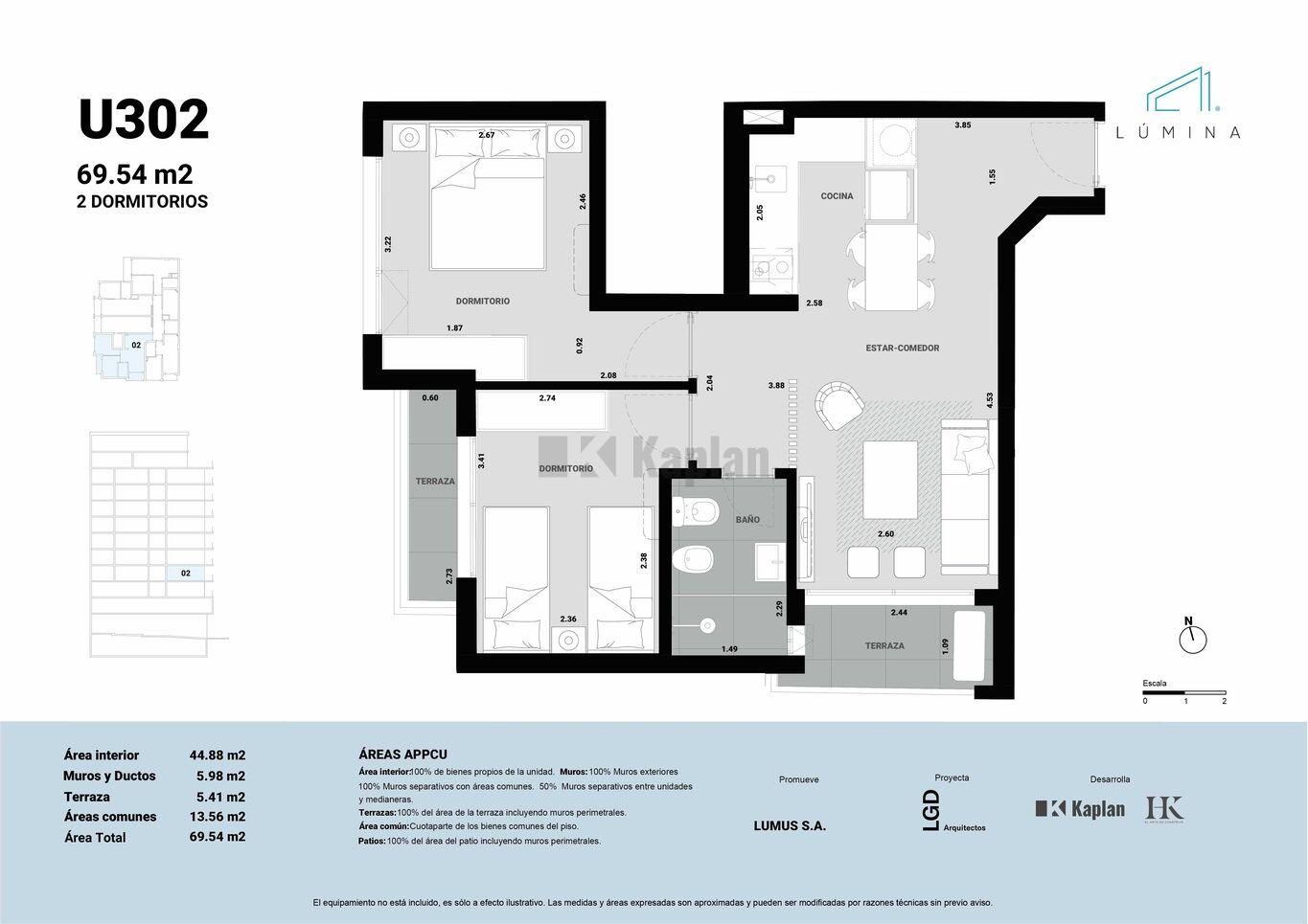 Los apartamentos presentan un diseño moderno de planta libre que integra la cocina con la sala de estar, favoreciendo la luminosidad y amplitud. Cada cocina está equipada con campana, horno y anafe eléctrico, asi como la preinstalación para aire acondicionado. Todos los apartamentos dan al frente y cuentan con terrazas privadas con barandas de vidrio.