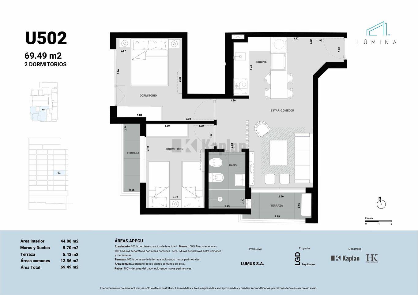 Los apartamentos presentan un diseño moderno de planta libre que integra la cocina con la sala de estar, favoreciendo la luminosidad y amplitud. Cada cocina está equipada con campana, horno y anafe eléctrico, asi como la preinstalación para aire acondicionado. Todos los apartamentos dan al frente y cuentan con terrazas privadas con barandas de vidrio.