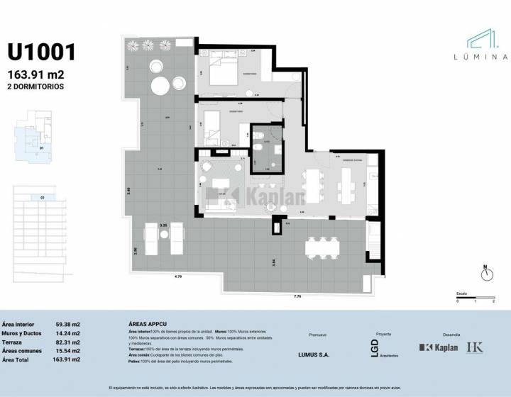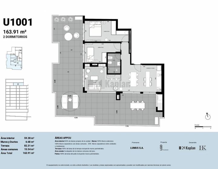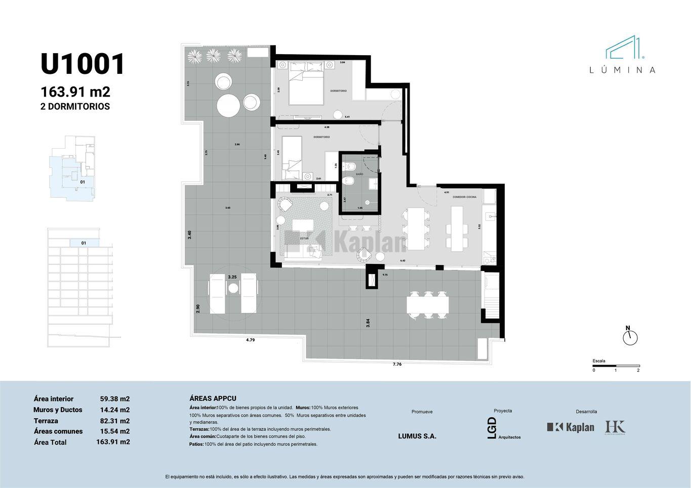 Los apartamentos presentan un diseño moderno de planta libre que integra la cocina con la sala de estar, favoreciendo la luminosidad y amplitud. Cada cocina está equipada con campana, horno y anafe eléctrico, asi como la preinstalación para aire acondicionado. Todos los apartamentos dan al frente y cuentan con terrazas privadas con barandas de vidrio.