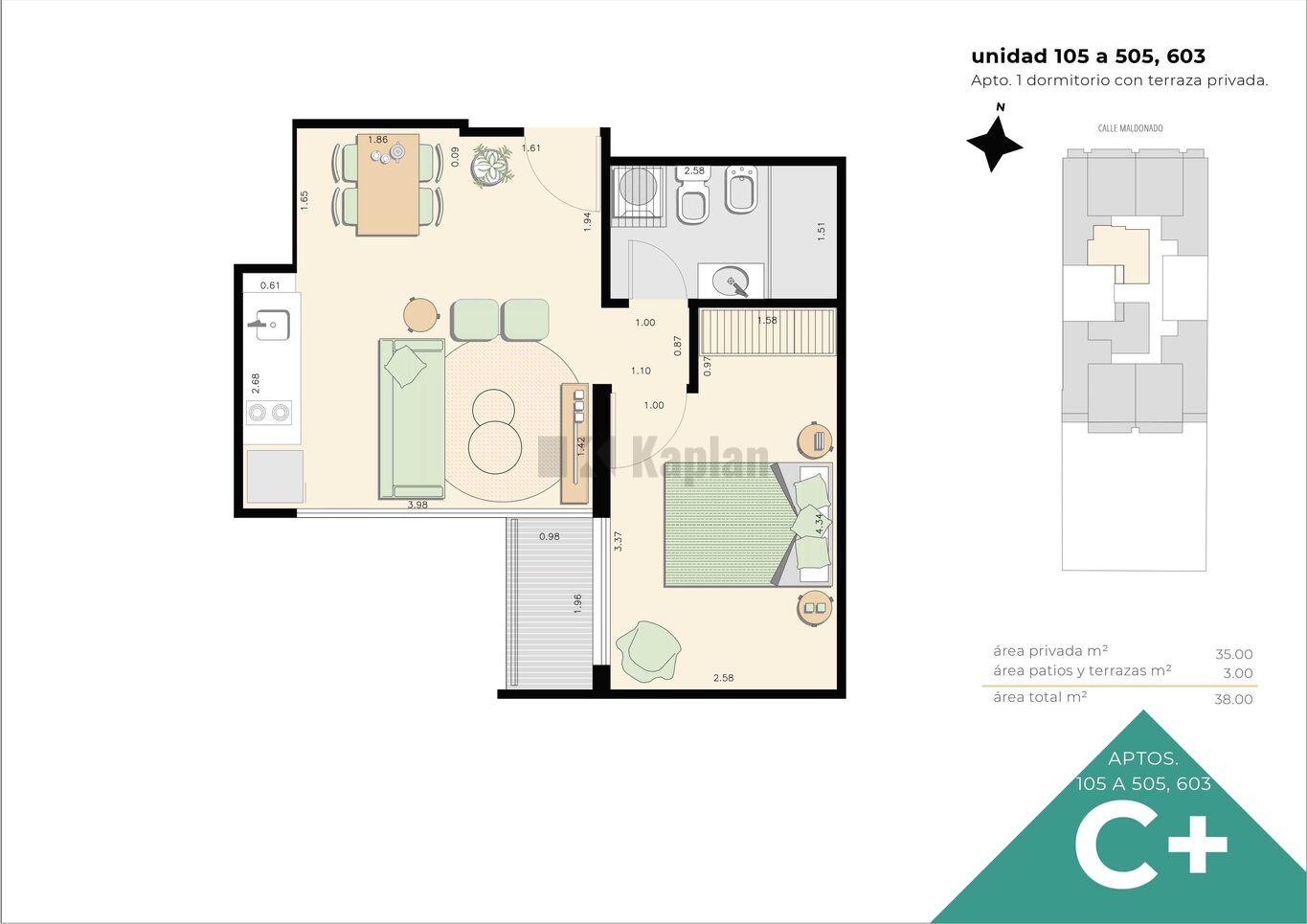 Los apartamentos son entregados con cocinas equipadas: horno, anafe, y campanas de extracción, placares aéreos y bajo mesada. Placares en dormitorio y baños. Previsión para lavadora y Aire Acondicionado.