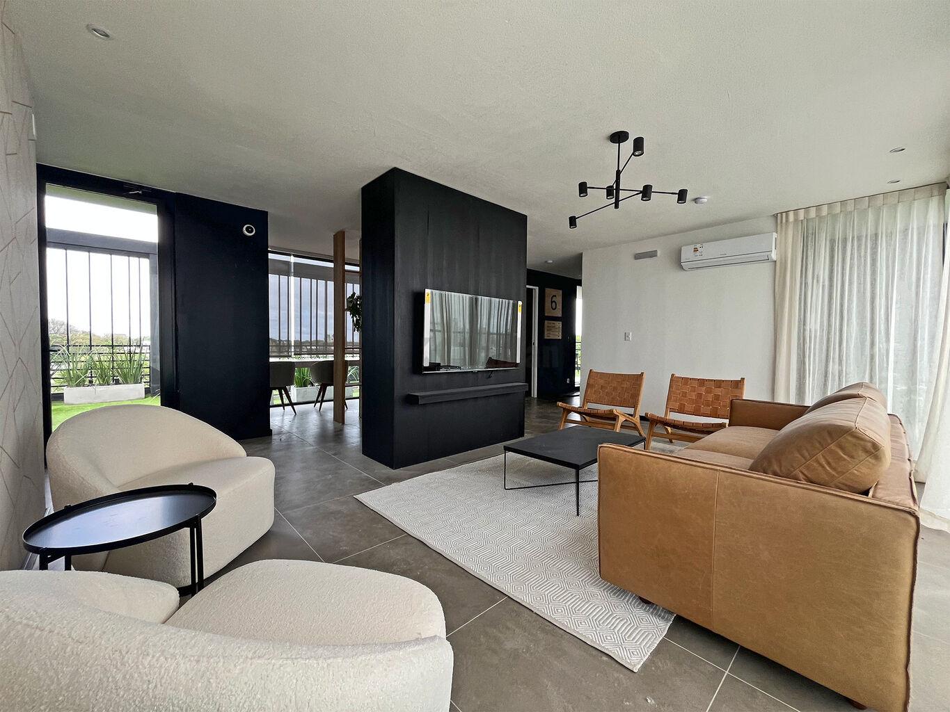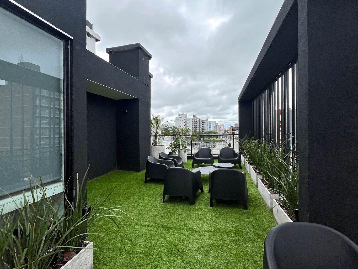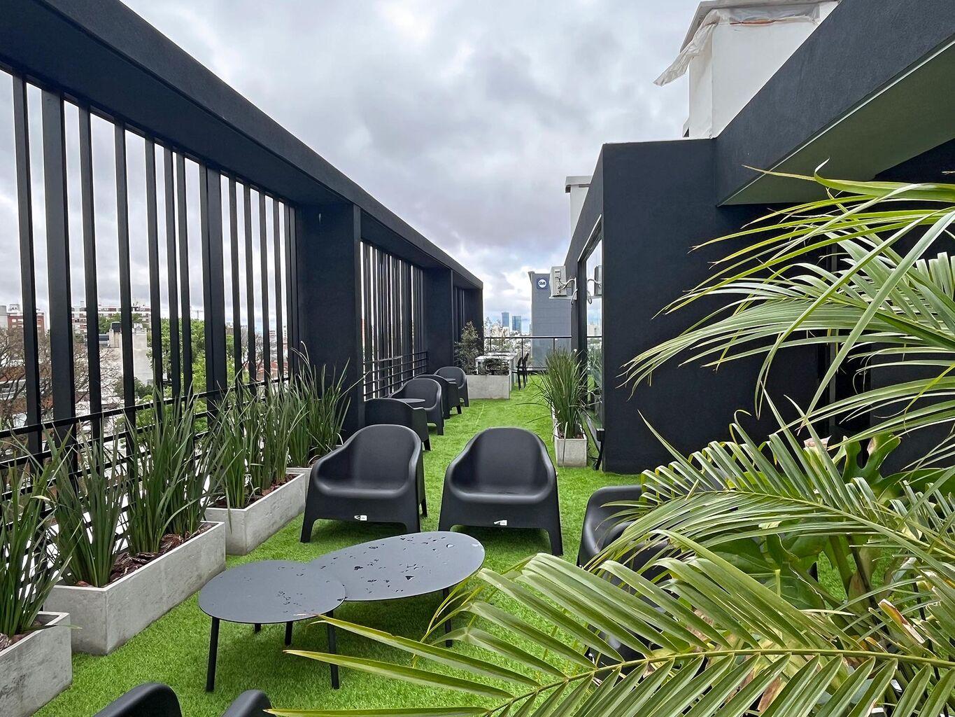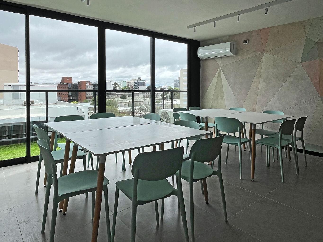 El edificio esta formado por dos torres de 5 niveles de apartamentos de 1 dormitorio y monoambientes, subsuelo de estacionamientos y se completa con una terraza con Amenities de primer nivel: salón de usos múltiples, gimnasio, un rincón infantil, solárium, parrillero interior con kitchenette, parrillero exterior techado y dos terrazas con vistas despejadas de la cuidad.