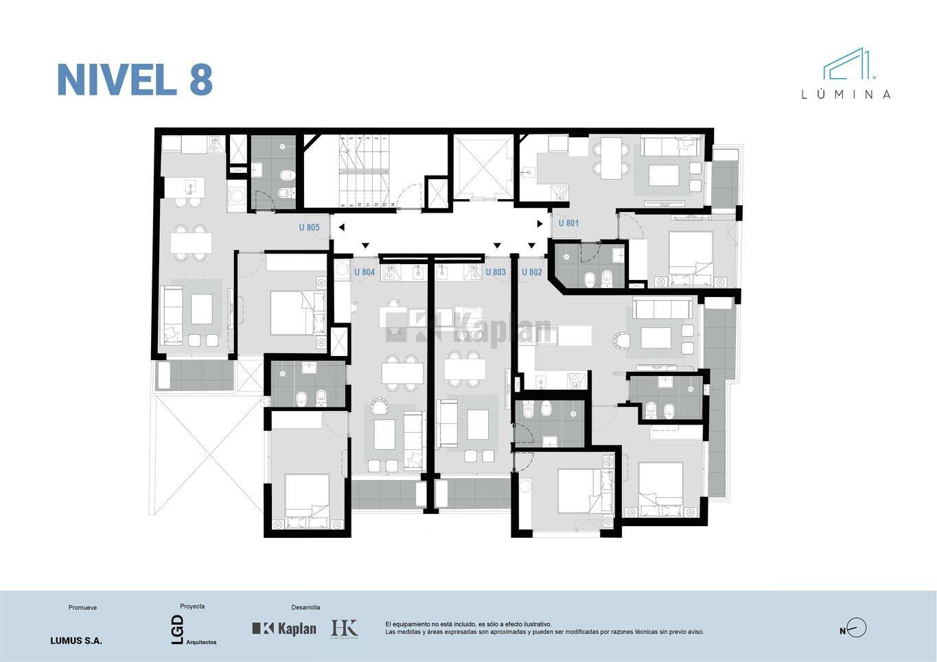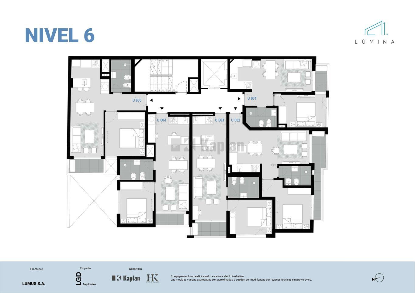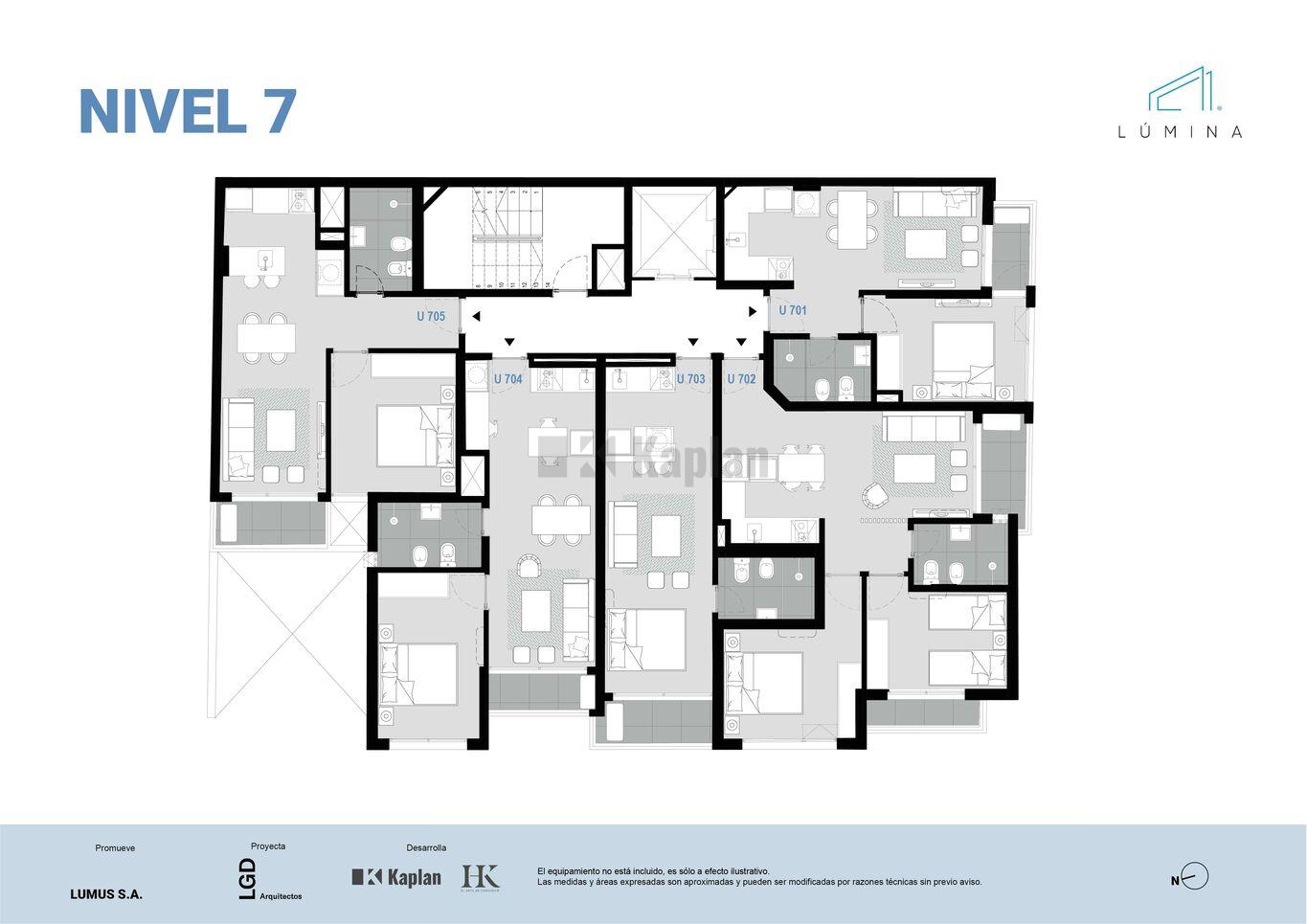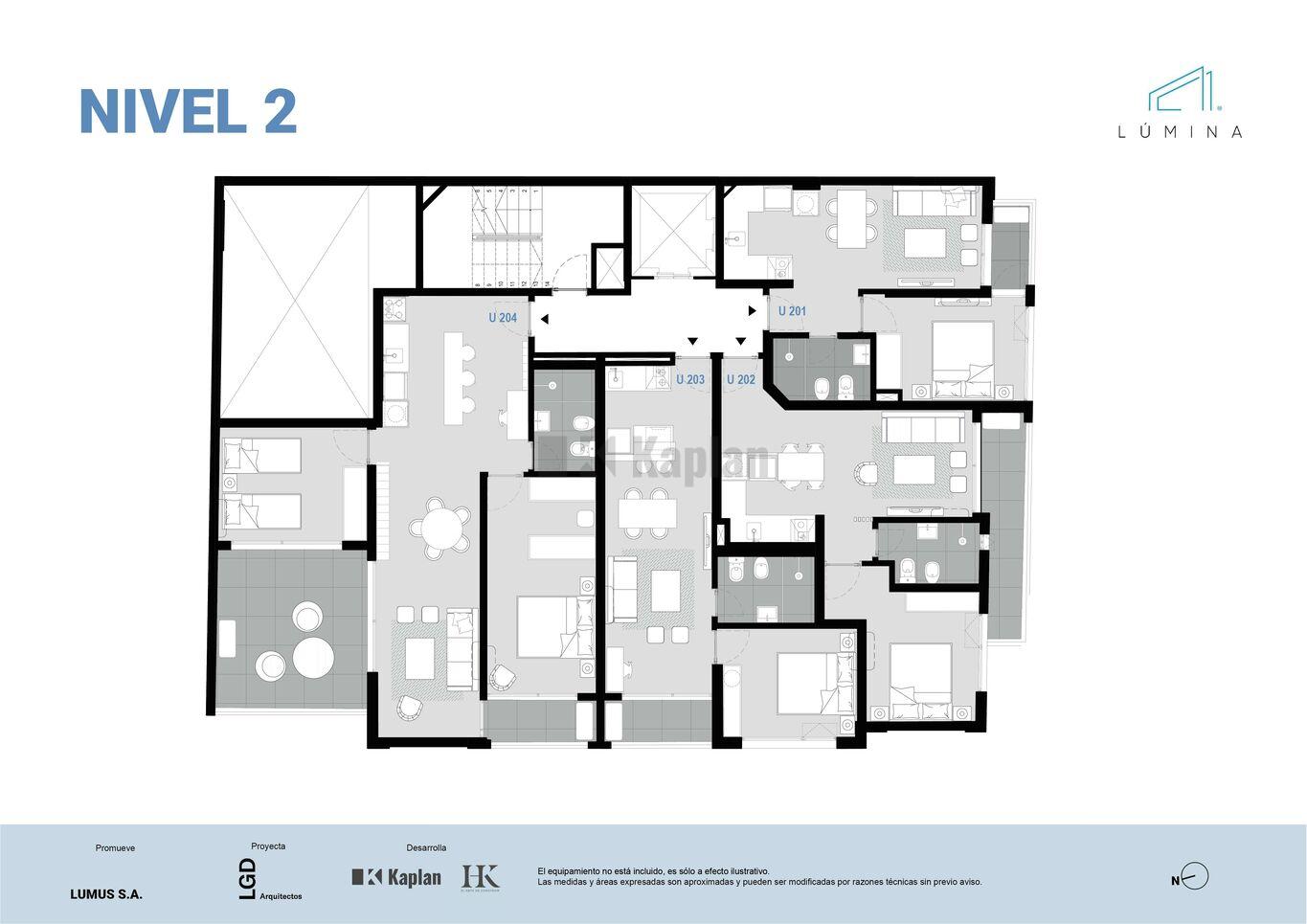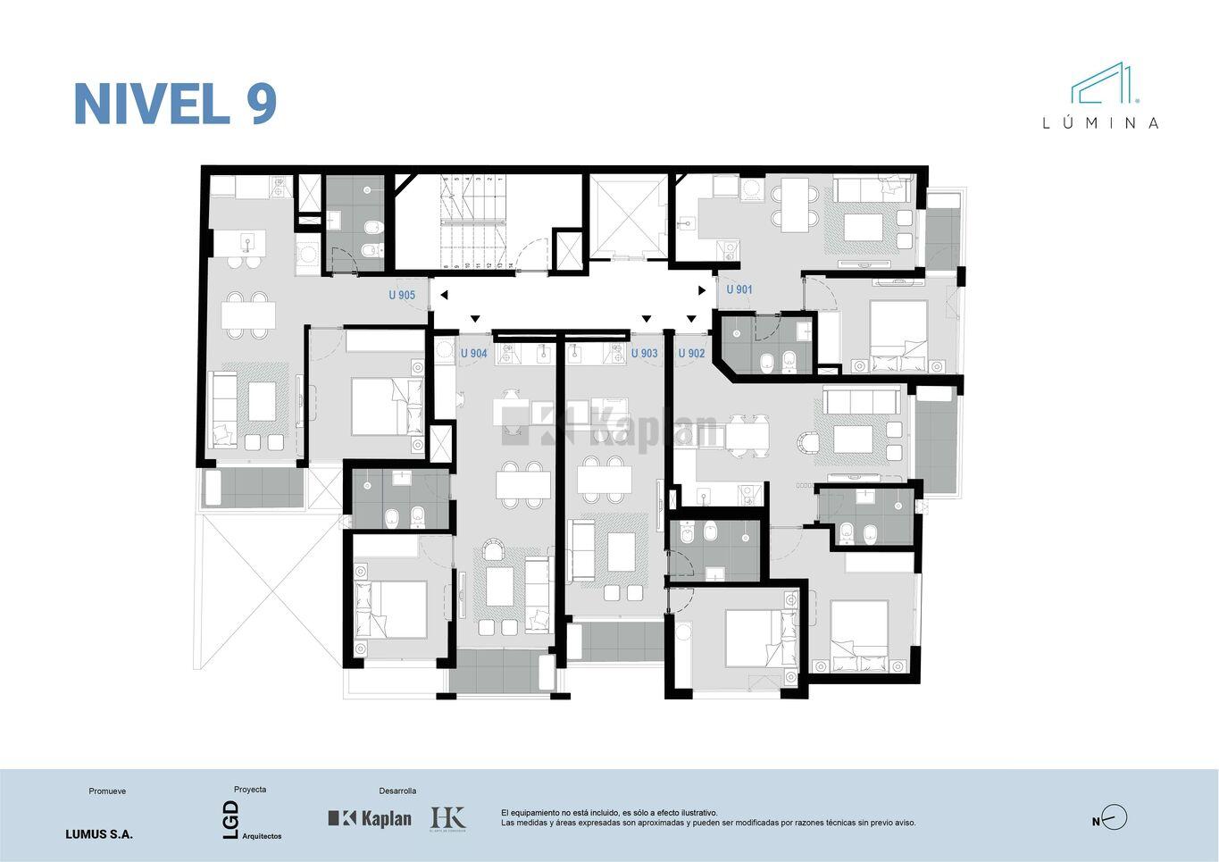 Los apartamentos presentan un diseño moderno de planta libre que integra la cocina con la sala de estar, favoreciendo la luminosidad y amplitud. Cada cocina está equipada con campana, horno y anafe eléctrico, asi como la preinstalación para aire acondicionado. Todos los apartamentos dan al frente y cuentan con terrazas privadas con barandas de vidrio.