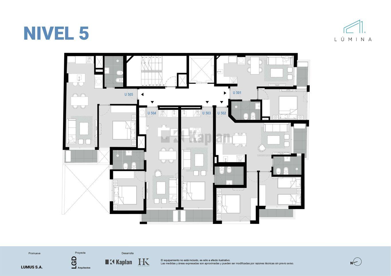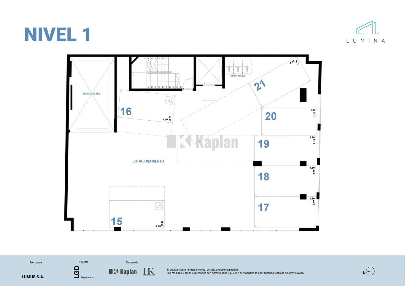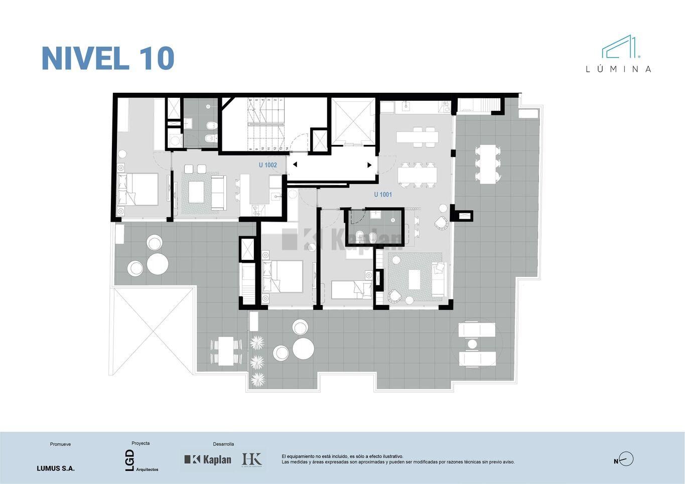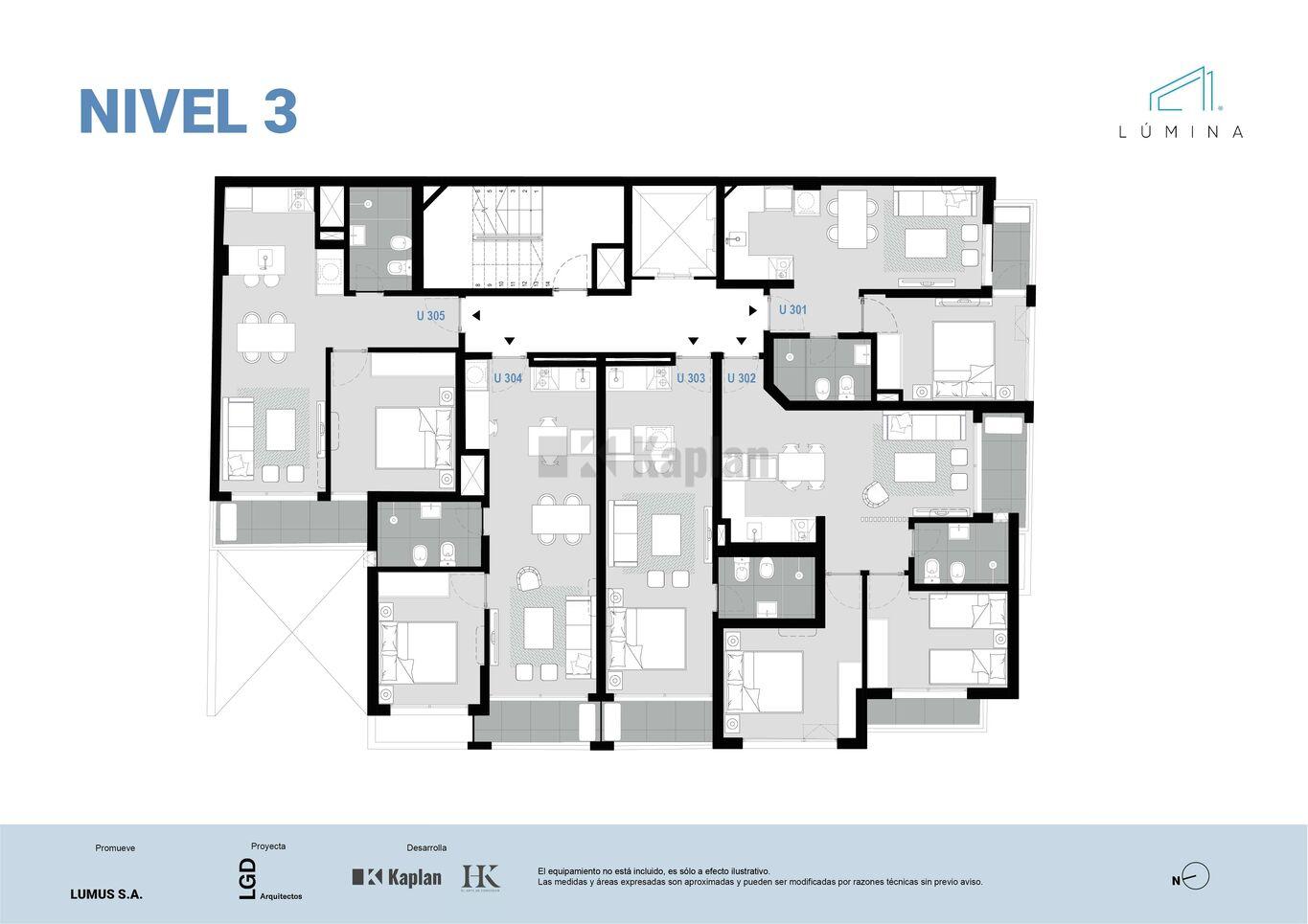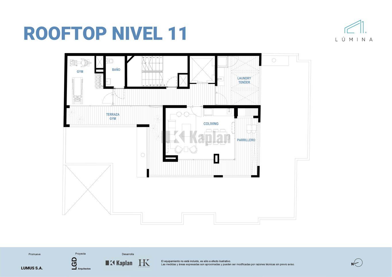 Los apartamentos presentan un diseño moderno de planta libre que integra la cocina con la sala de estar, favoreciendo la luminosidad y amplitud. Cada cocina está equipada con campana, horno y anafe eléctrico, asi como la preinstalación para aire acondicionado. Todos los apartamentos dan al frente y cuentan con terrazas privadas con barandas de vidrio.