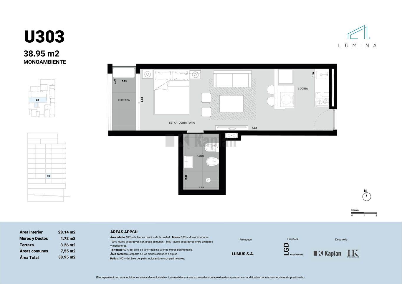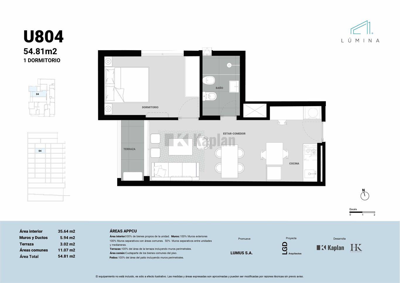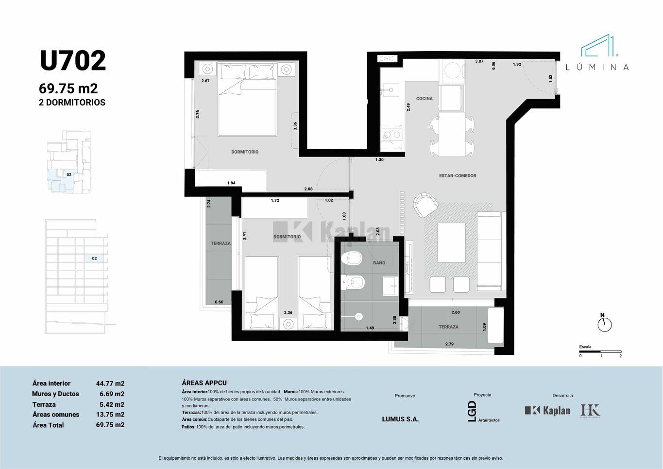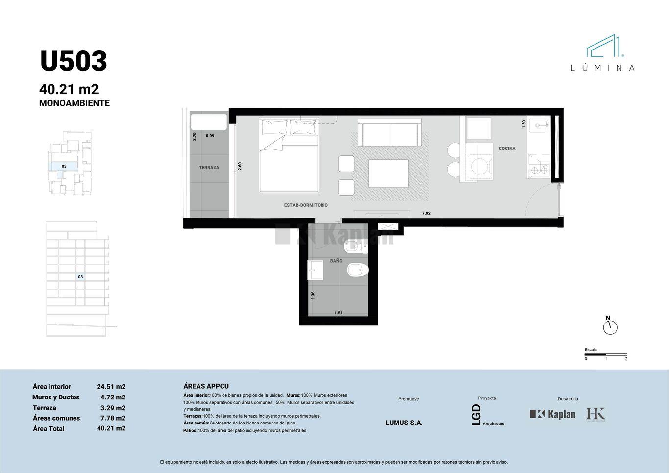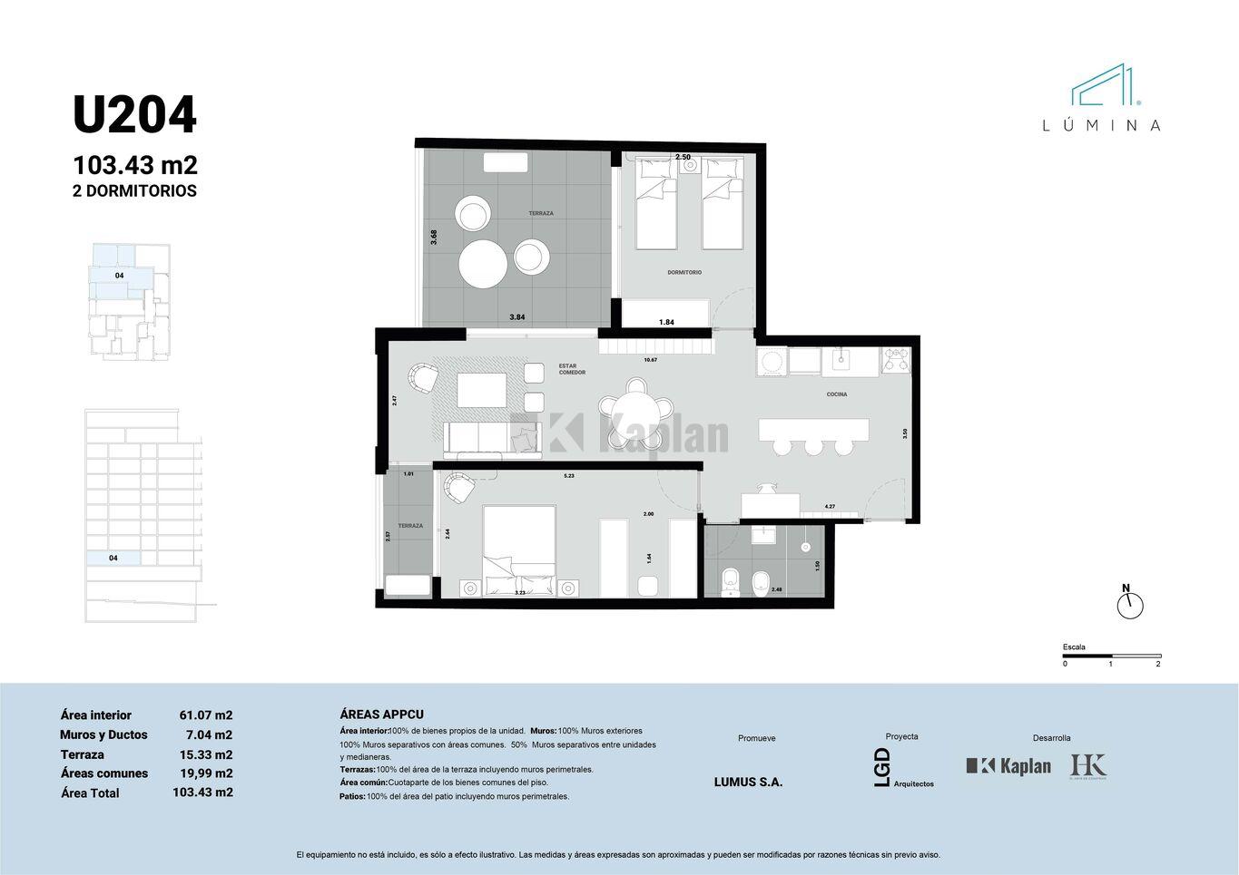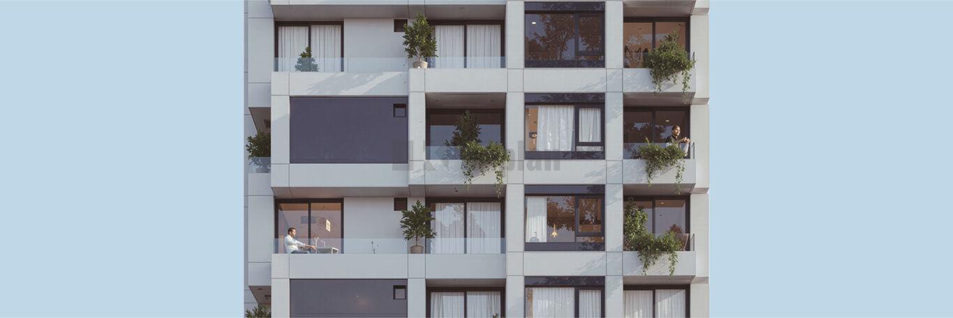 Los apartamentos presentan un diseño moderno de planta libre que integra la cocina con la sala de estar, favoreciendo la luminosidad y amplitud. Cada cocina está equipada con campana, horno y anafe eléctrico, asi como la preinstalación para aire acondicionado. Todos los apartamentos dan al frente y cuentan con terrazas privadas con barandas de vidrio.