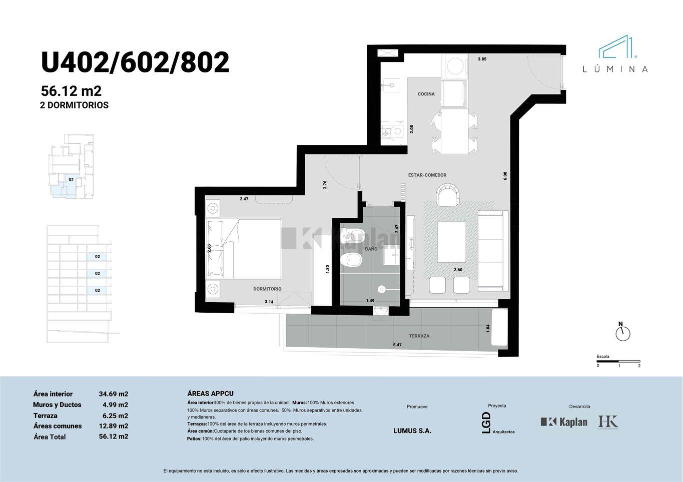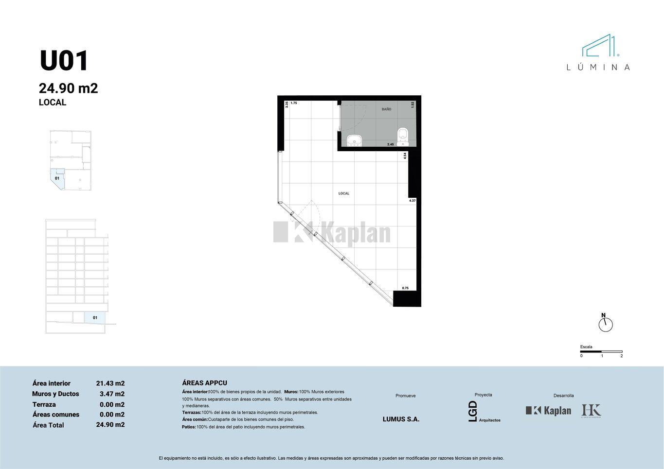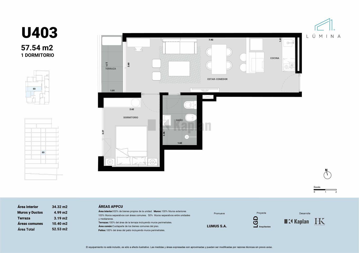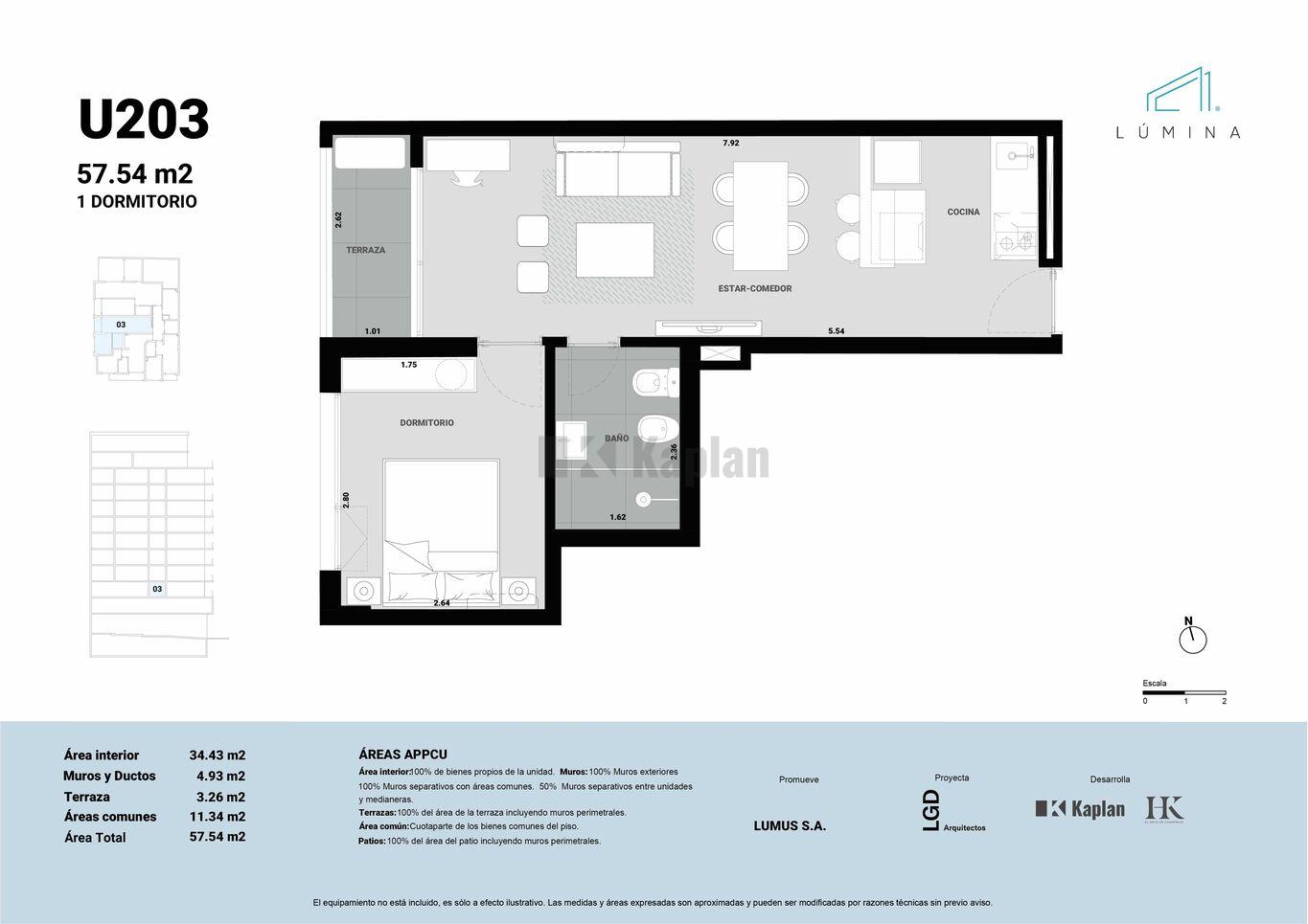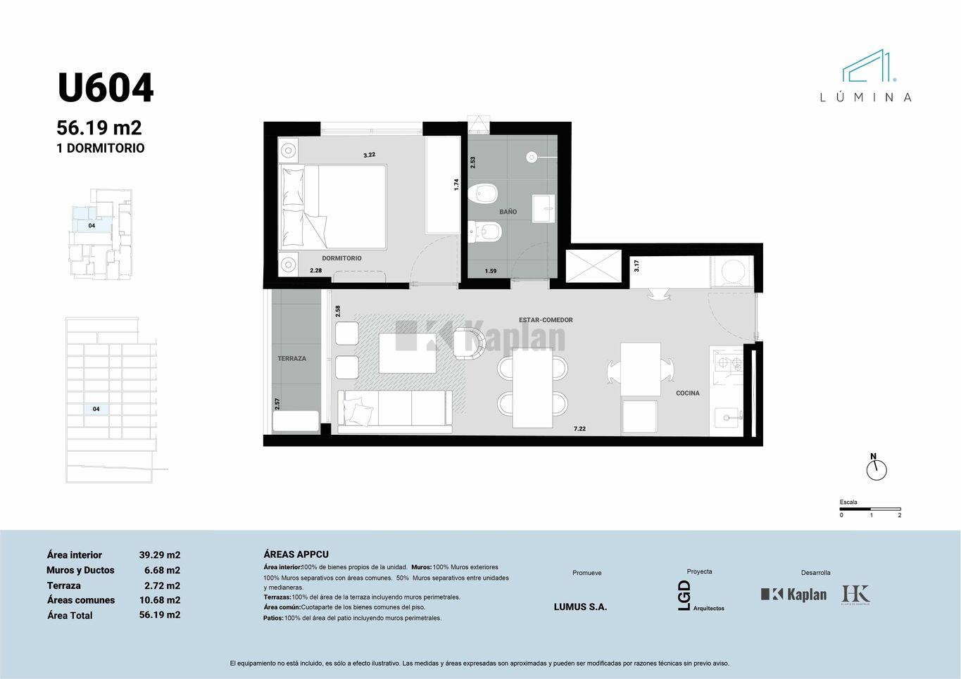 Los apartamentos presentan un diseño moderno de planta libre que integra la cocina con la sala de estar, favoreciendo la luminosidad y amplitud. Cada cocina está equipada con campana, horno y anafe eléctrico, asi como la preinstalación para aire acondicionado. Todos los apartamentos dan al frente y cuentan con terrazas privadas con barandas de vidrio.