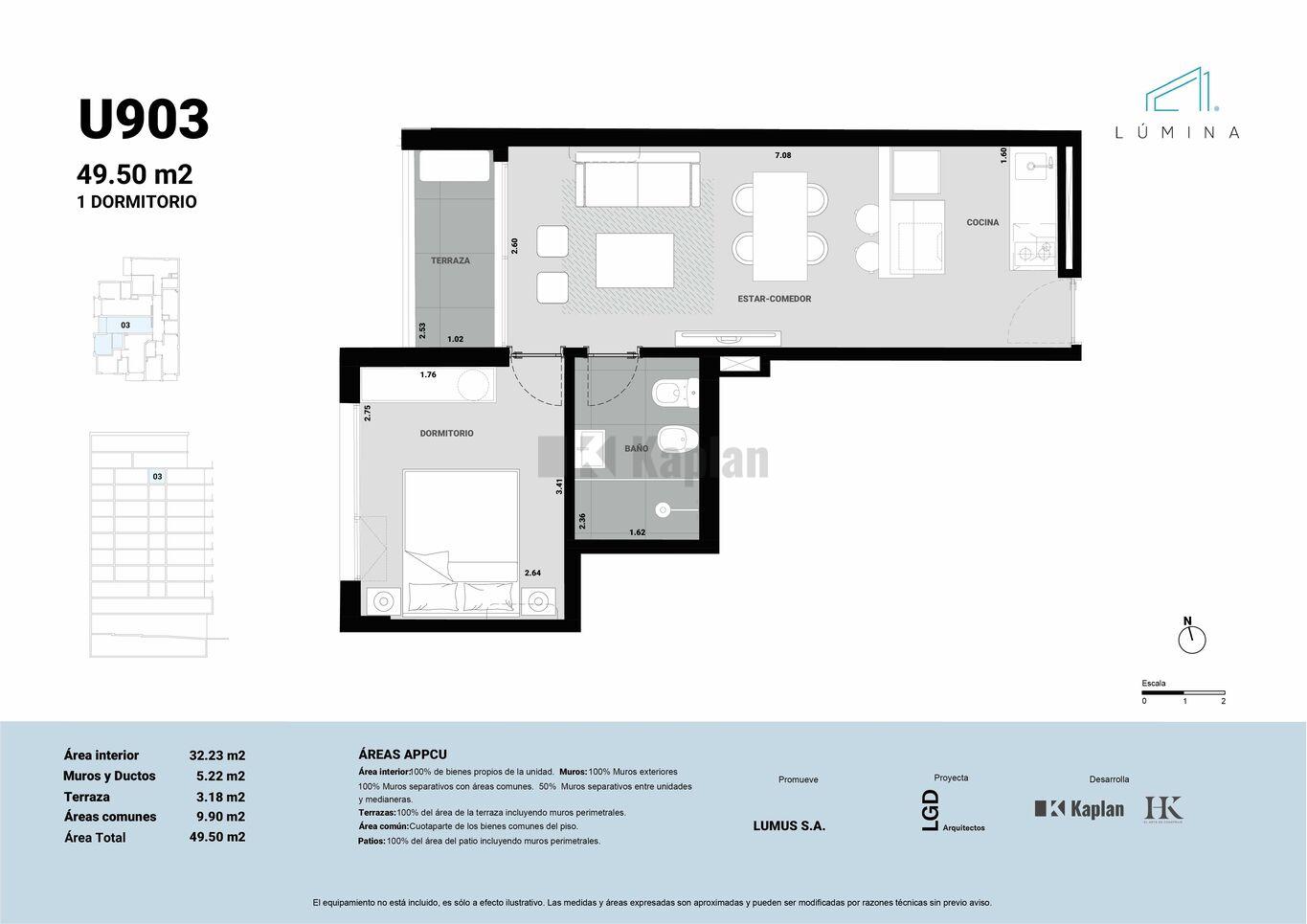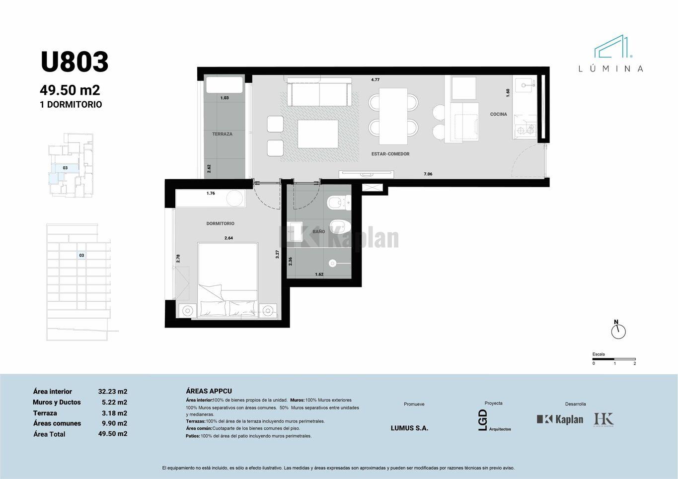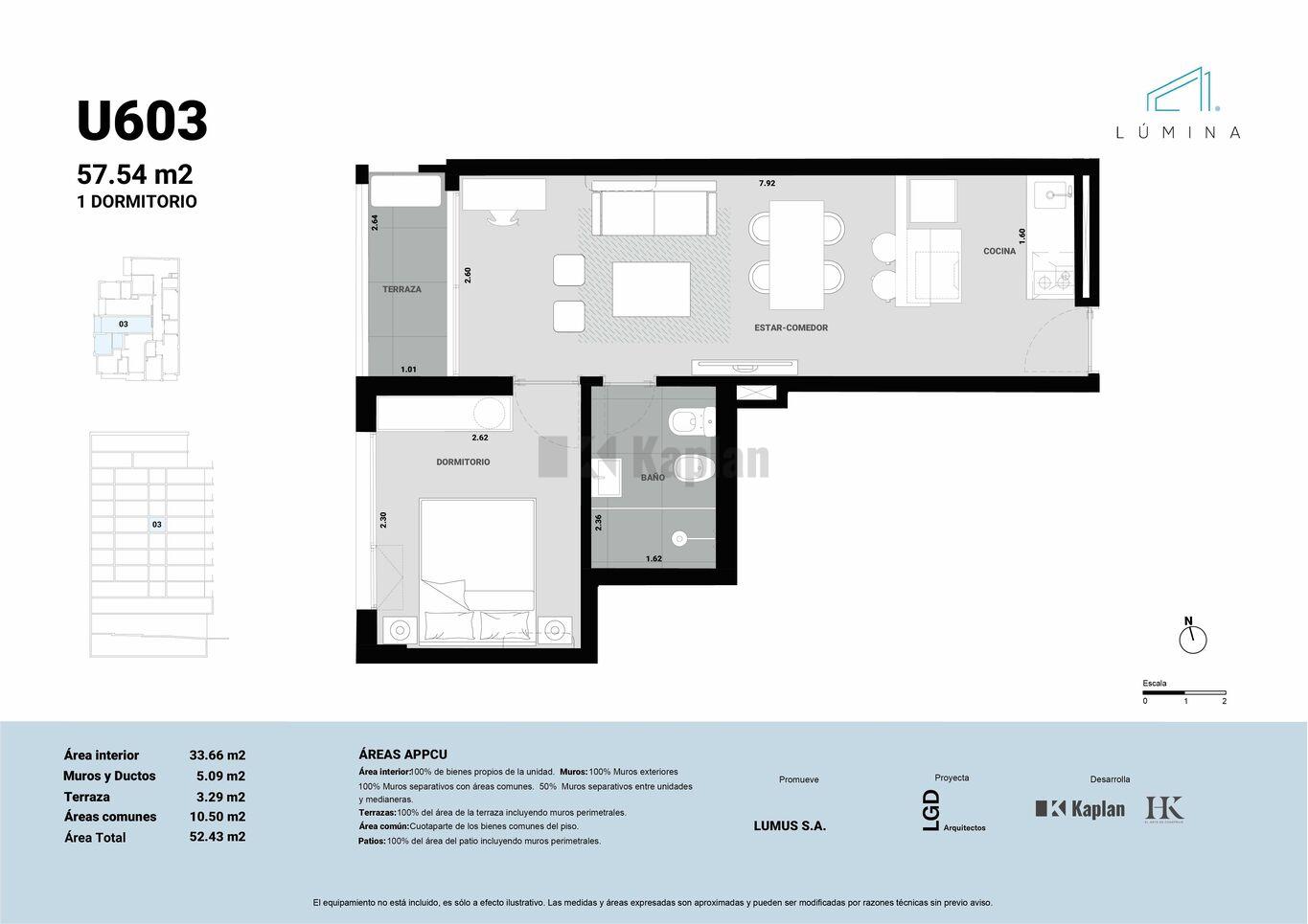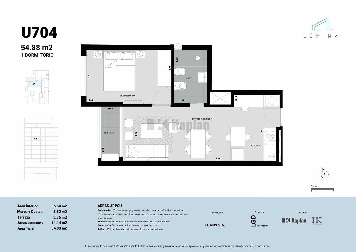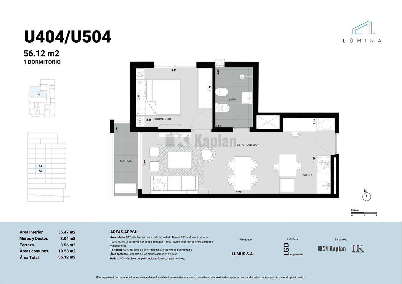 Los apartamentos presentan un diseño moderno de planta libre que integra la cocina con la sala de estar, favoreciendo la luminosidad y amplitud. Cada cocina está equipada con campana, horno y anafe eléctrico, asi como la preinstalación para aire acondicionado. Todos los apartamentos dan al frente y cuentan con terrazas privadas con barandas de vidrio.